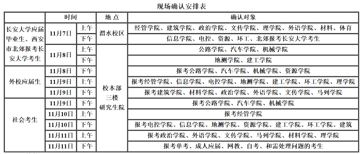 根据教育部和陕西省关于硕士研究生招生考试报名有关要求,现将长安大学考点现场确认工作安排如下,请各位考生按照要求办理现场确认、缴费、采集考生本人图像信息等手续,逾期不再补办。